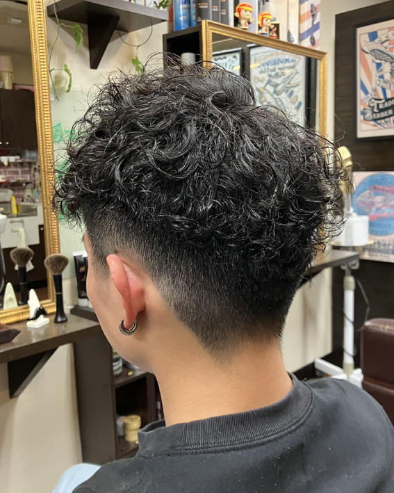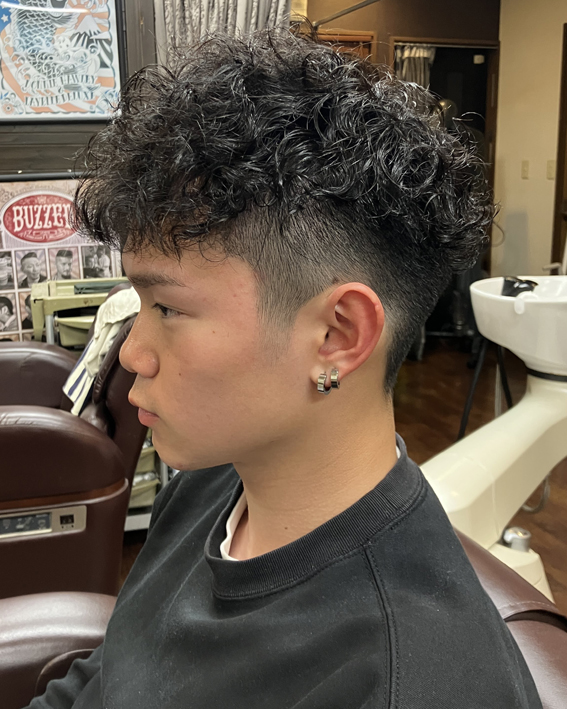 サイドからバックにかけて高めのフェードで刈り上げ、トップには強めのカールを施したスペインカールスタイル。硬毛・多毛でもしっかり動きが出るよう、パーマの強さと毛量調整にこだわった設計です。ストリート感のあるシルエットながら、校則にも配慮した清潔感ある仕上がりが魅力。