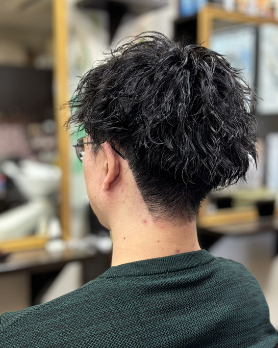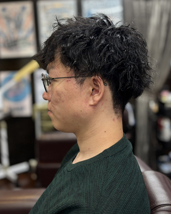 前髪は眉上で設定し、目元の印象をすっきりと。耳まわりもタイトに仕上げることで、パーマの中にも爽やかさを演出しています。