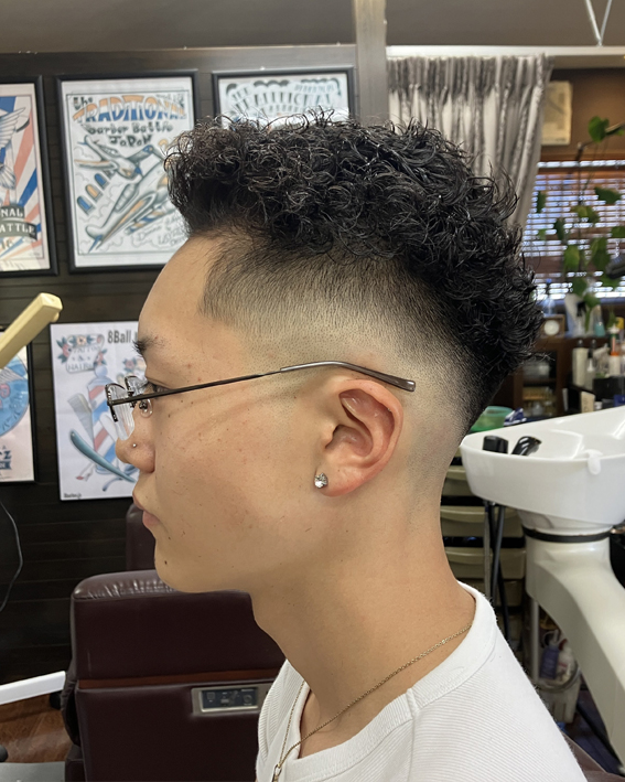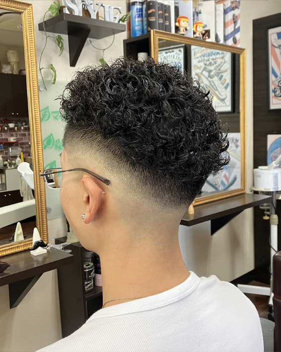 男らしさ全開。ハイスキンフェードで潔く刈り上げ、トップはオールバックに流したツヤ感パーマ。