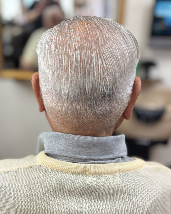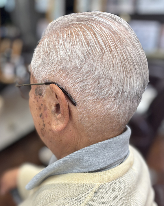 サイドは3mmのバリカンで半分ほどの高さまで刈り上げ、すっきりとした印象に。